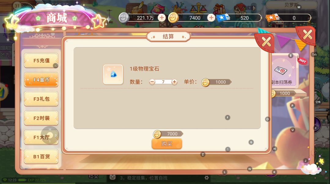 宝石的话也是提升战力的一个很重要的点,这个宝石你想提升战力,前期就是最好的,性价比也是最高的,也是最简单的宝石,也是最有效的,前期提升战力宝石是很有效的,他这个宝石在商城里面就可以购买,一个1000金币可以买一个宝石,然后金币怎么换,金币在游戏里面可以用点券换取,看一个点券可以换到100金币,就相当于是十块钱,就是不是相当于是一块钱换1000金币,就相当于是一块钱一个宝石,一块钱一个一级宝石。