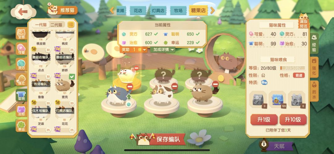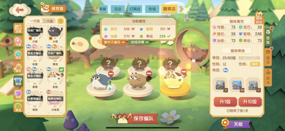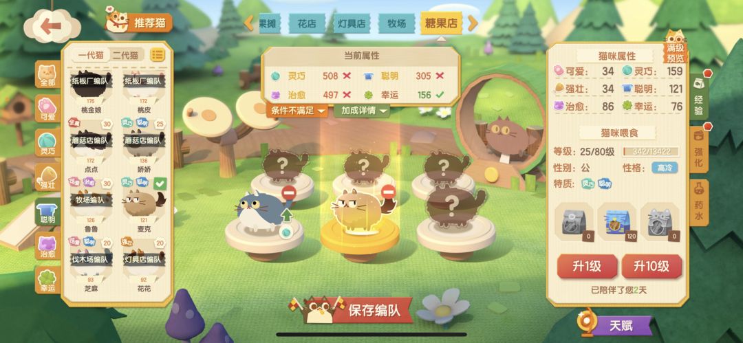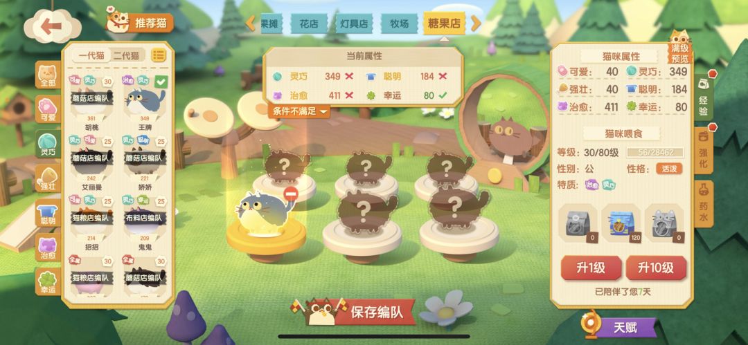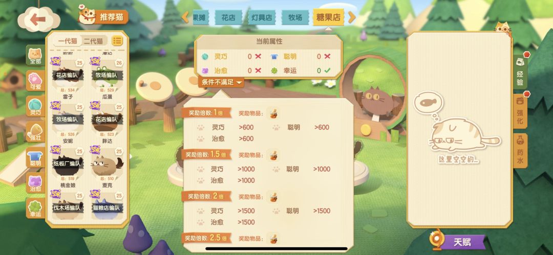 现在我需要在糖果店打工,需要600灵巧➕600治愈➕600幸运,那我就找灵巧治愈或者灵巧幸运或者治愈幸运双特质的猫猫,或者单一特质的猫猫,优先双特质的,因为我现在需要这三个特质的猫猫,给我强壮,聪明可爱堆到1000也没办法打这份工,这样就可以做到不让其他的数值溢出,保证需要的数值最大化利用。 于是我选择了灵巧治愈特质的王牌