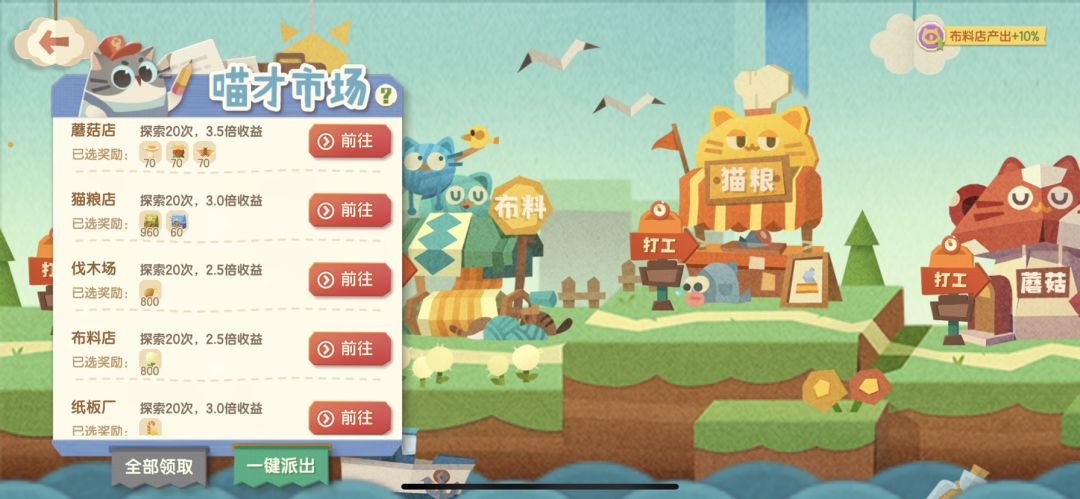 接下来,进入本文正题:如何进行打工配队?首先你要明白的一个点就是,打工优先度按照你的个人需求进行先后编排队伍的,你最缺什么你就优先打什么资源的工,如果你跟我一样佛系的话就可以打10份工,做个坏坏的资本家,使劲剥削我们的猫猫🤔但是主推还是猫粮,基础强化材料和你需要的家具店。