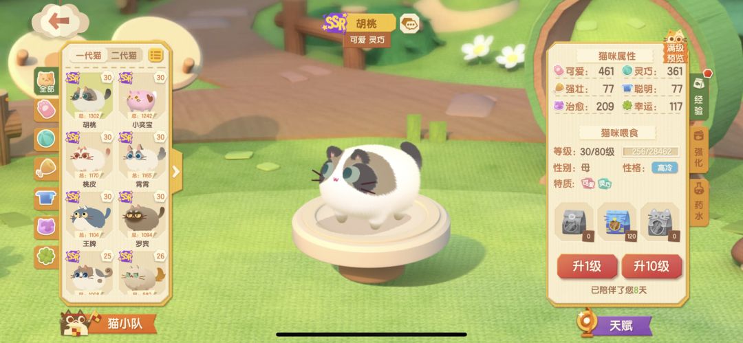 这个时候你就会发现不论是灵巧治愈,聪明都在550左右了,所以只需要一个这三个数值在50左右的,可是不会有那么凑巧的事情的,所以你就需要不断地在灵巧聪明治愈这三栏里找到数值都在50以上的猫猫,功夫不负有心人,我找到了。