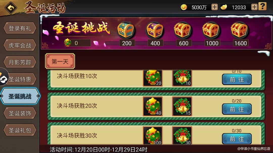 2022年圣诞节饕餮盛宴如约而至,比以往来得更早一天!新武将步练师实力几何敬请期待,独有的装饰类活动:圣诞树装饰,大家久待多时了,福惠相赠的好事,岂能袖手旁观,惠利活动必须一网打尽……世界杯余温尚存,立马衔接我们所钟爱手游的圣诞节活动,确实是三国战纪手游拥趸们的狂欢盛宴,参与其中,喜庆连连收资源,开开心心升战力,还有比这更美妙的休闲小方式吗?相信小伙伴们早已计划多时,也准备了能力范畴内最大化的粮草储备,保守的果服和全渠道玩家还可以预存三天体力,圣诞节满载而归指日可待!接下来书童和大家说说圣诞挑战专场,因为这是圣诞装饰物“铃铛”最主要的来源途径。