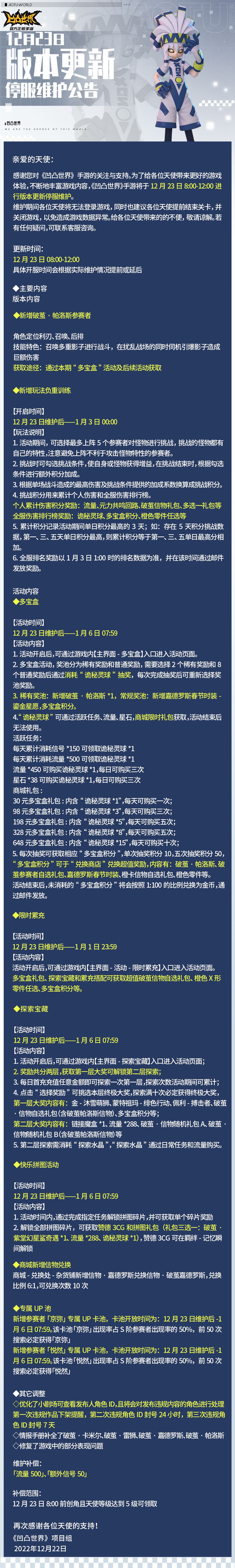 感谢您对《凹凸世界》手游的关注与支持。为了给各位天使带来更好的游戏体验,不断地丰富游戏内容,《凹凸世界》手游将于12月23日8:00-12:00进行版本更新停服维护。