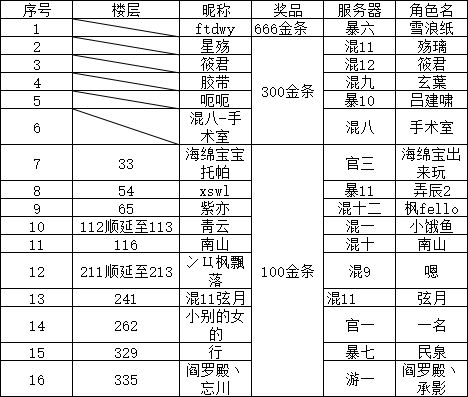 活动的获奖名单来啦,让我们一起来看一下本次有哪些侠士中奖了吧,大家请务必记得参与后续活动时直接留言自己的区服角色名,以便我们后续发奖统计。