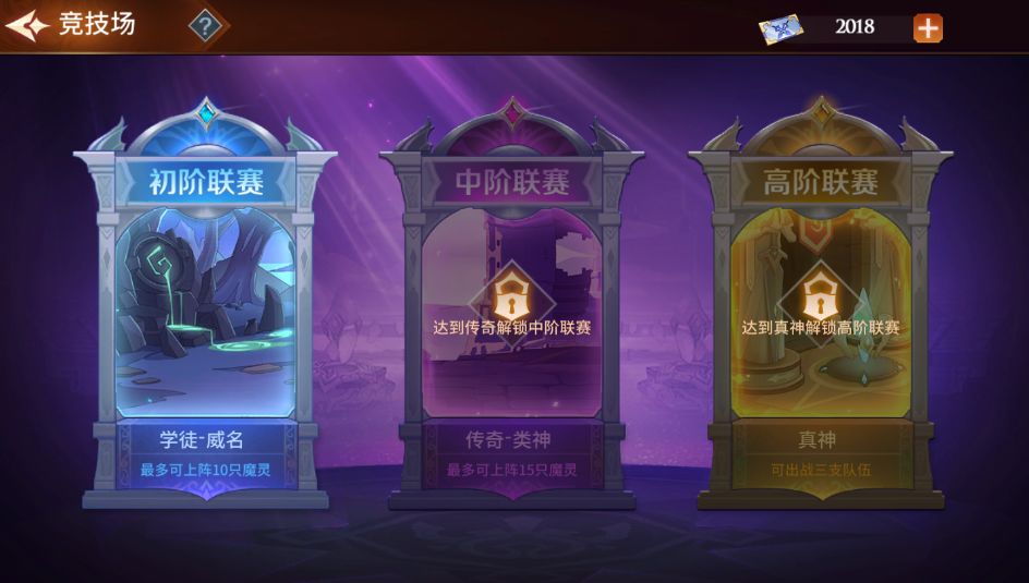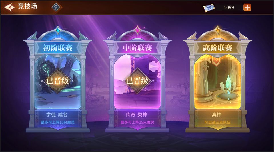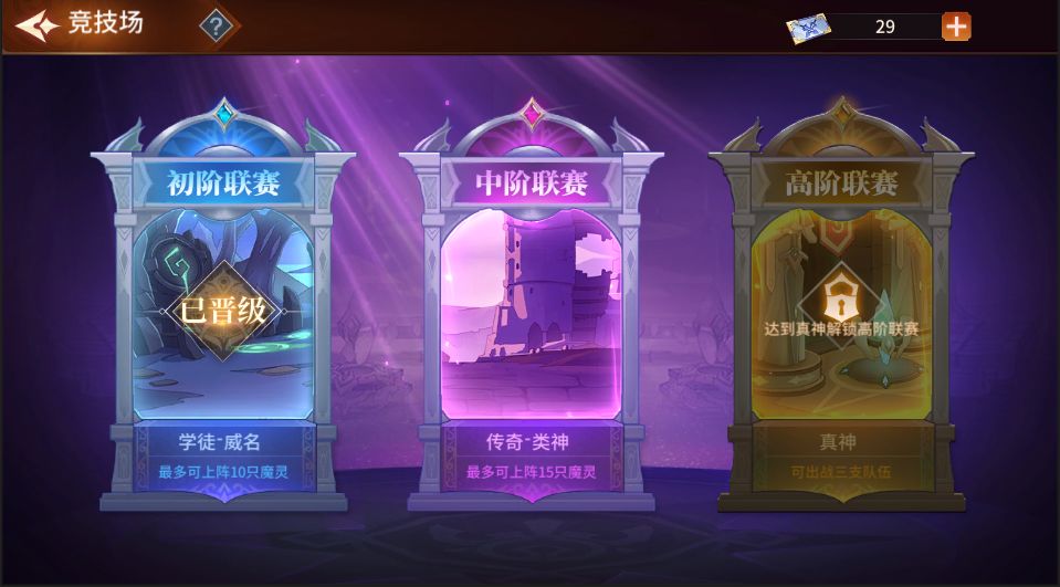 从图中我们可以看到总共有初阶、中阶、高阶三大联赛,当然,不同的联赛就对应不同的比赛规则哈,现在让艾丽来给你说道说道~