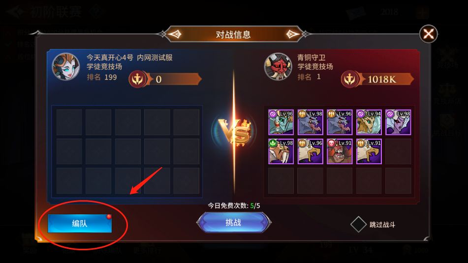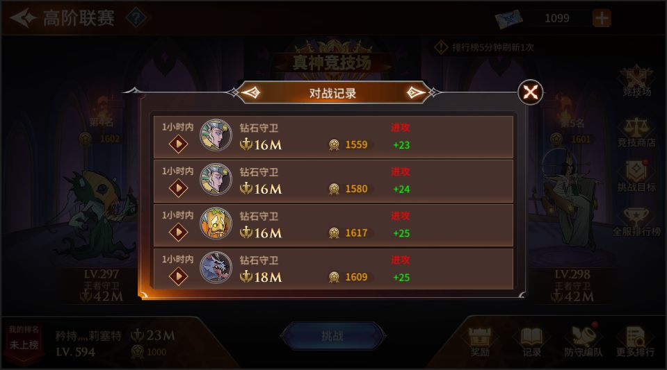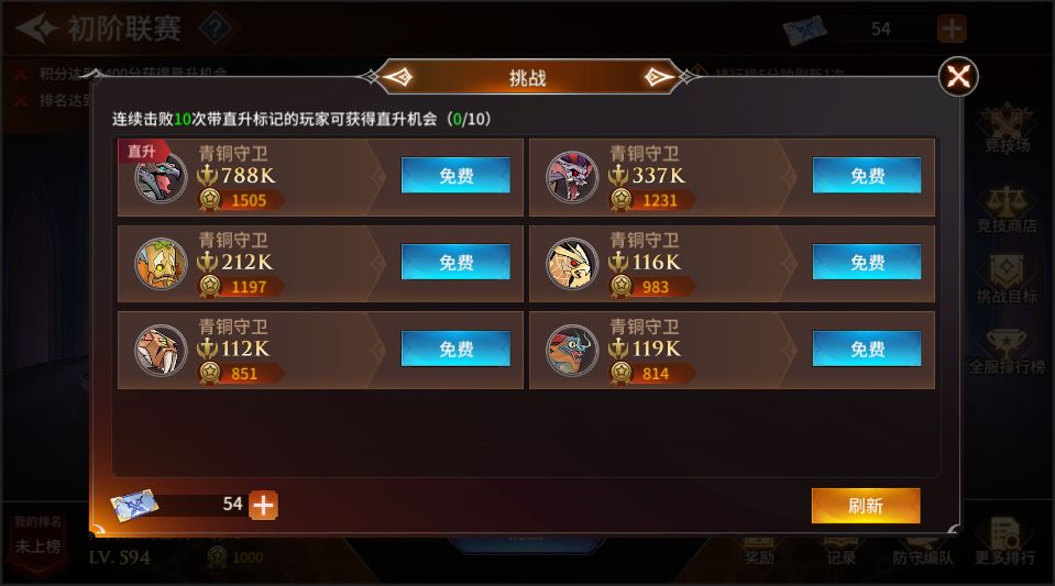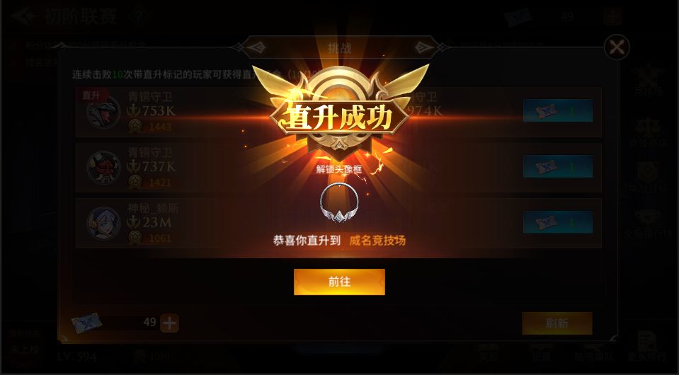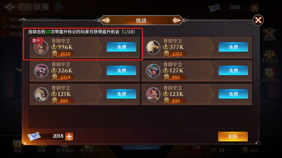 点击【挑战】,随机出现六名不同战力值的玩家,如果击败他们后,便可以获得联赛积分,提升自己段位或在联赛中的排名(挑战带“直升”标识的玩家,连续胜利10次将直接晋级段位)。