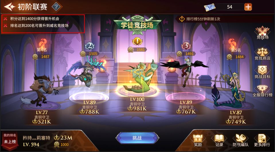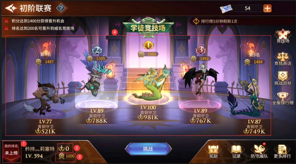 所有玩家的起始赛道哦!一点进来就是这个界面【学徒竞技场】,可以看到自己的排名[红色标记1]、防守队伍战力值[红色标记2]、联赛积分[红色标记3]和当前段位排名前五的玩家[红色标记4]。