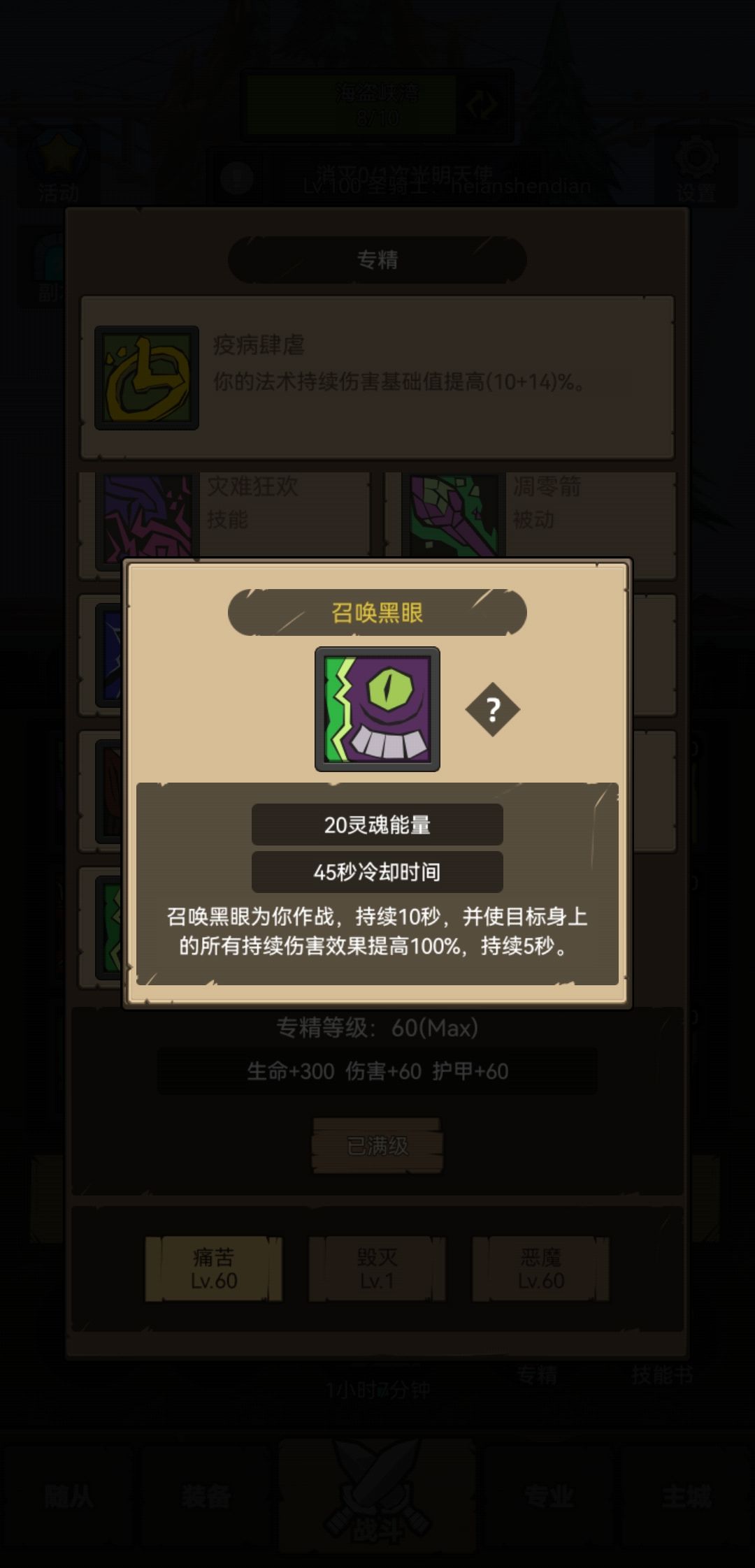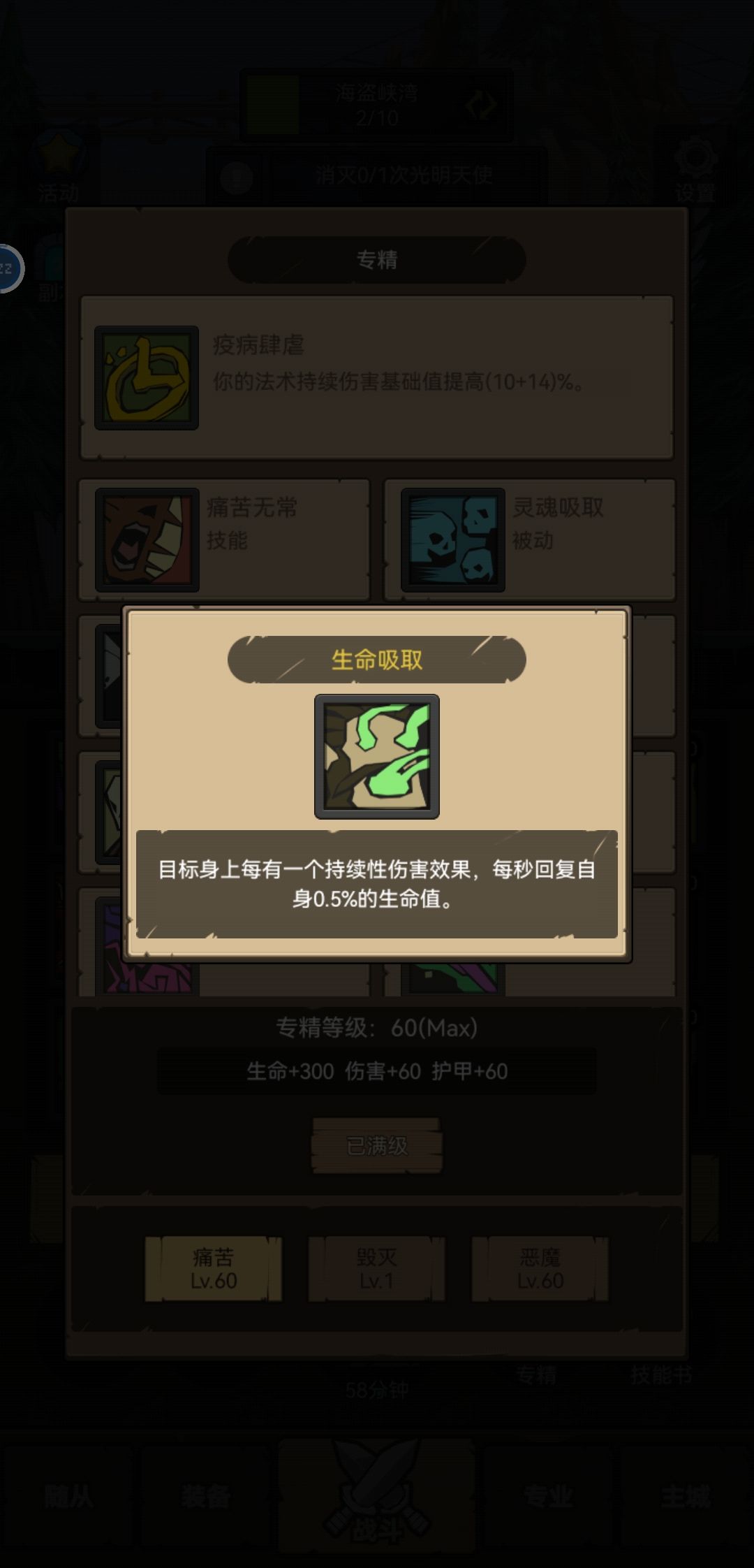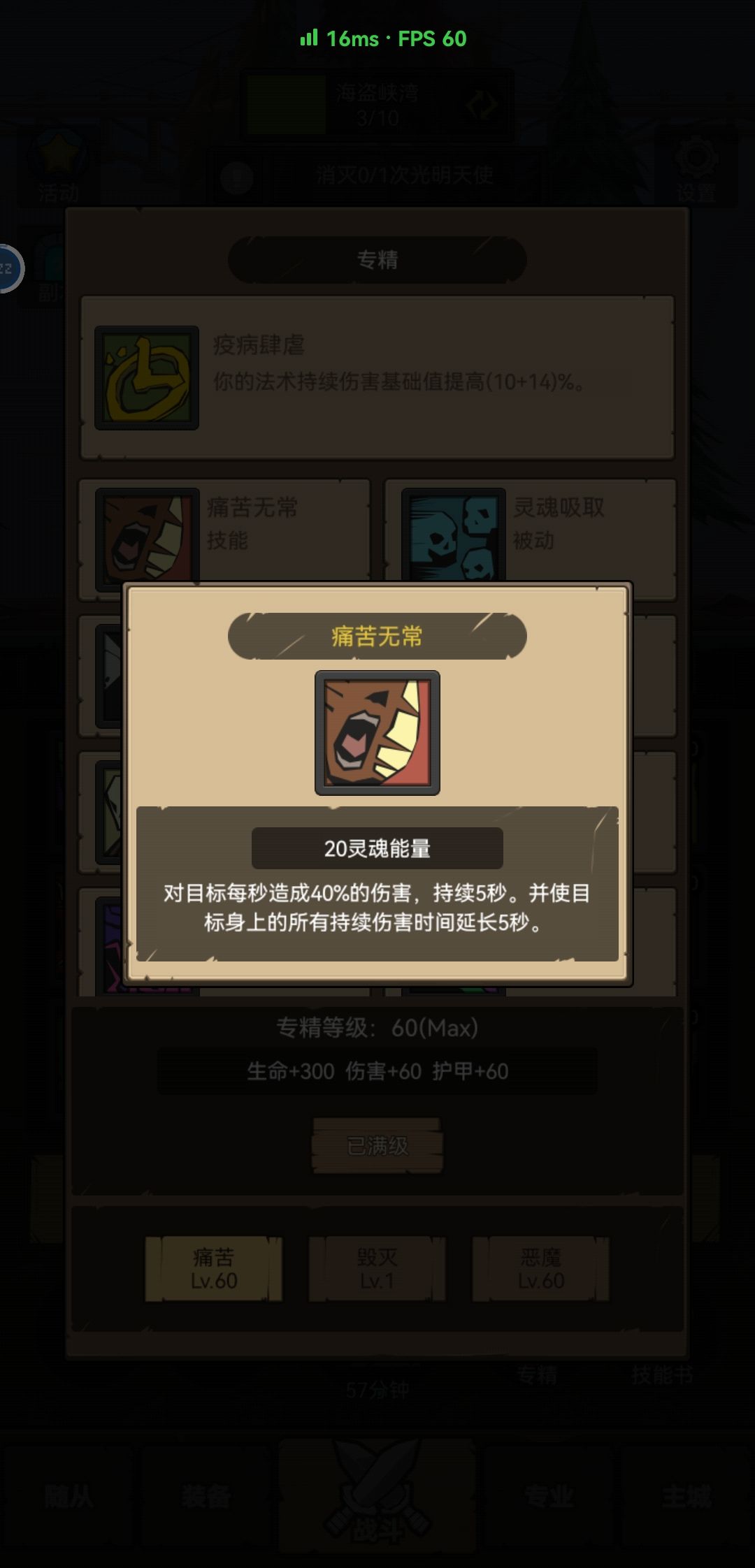 60级前没什么特别的,除了到60级后一定要开启恶魔术,但是不要升级,前期的宝宝还是挺强力的去爬塔能爬多少爬多少不管是宝石塔还是专精塔,然后升级痛苦术。