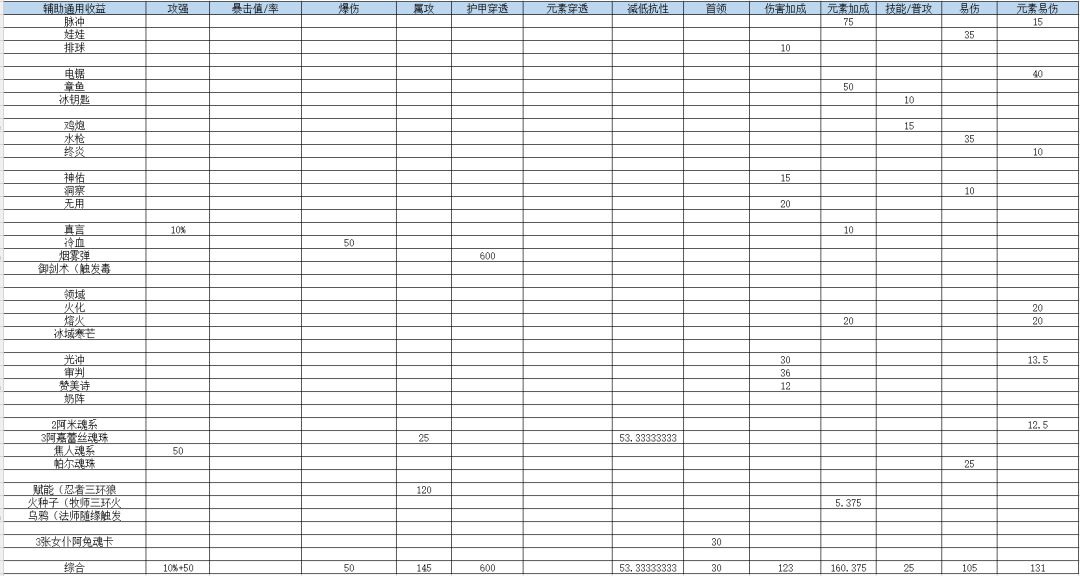 这里要说下由于辅助武器溢出,不能全带了,所以排球和燃舟是可以考虑的,如果卡的比较好的话排球的收益更高,但是燃舟不用切武器,会简单一些(如果主c元素穿透低于2300还是带燃舟吧)