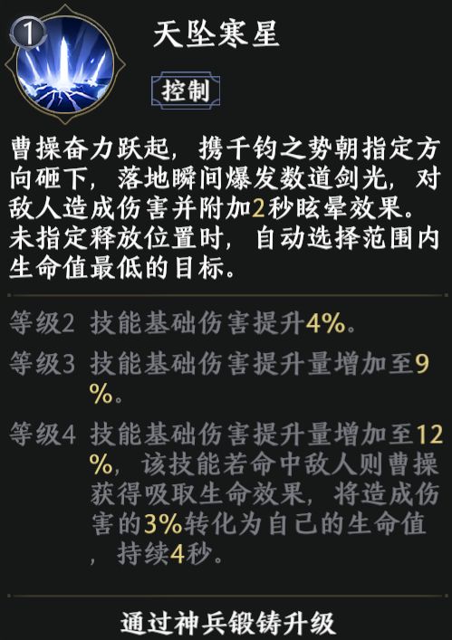 【天坠寒星】在升级至4级后,会增加吸取生命效果,将造成伤害的3%转化为自己的生命值,持续4秒,一定程度上提升了曹操的生存能力。