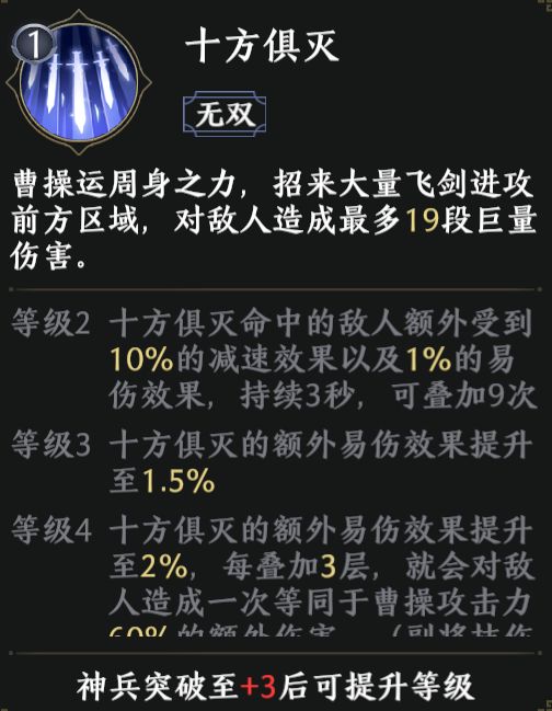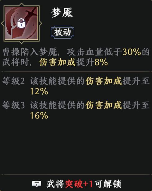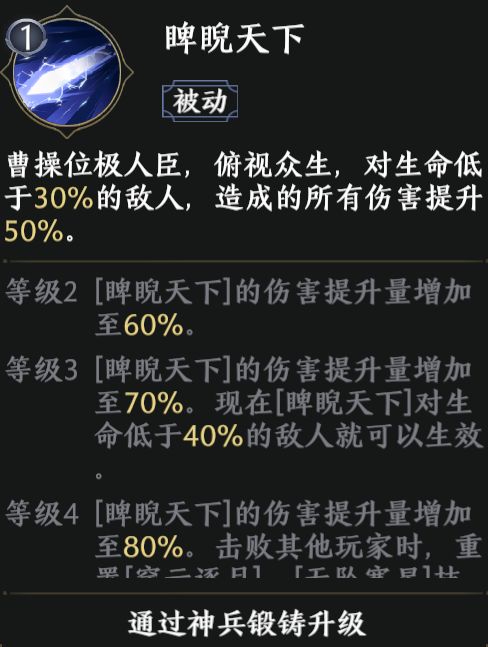 曹操突破加1时解锁。该天赋与曹操的被动【睥睨天下】,非常契合,同样是在攻击低血量敌人时伤害更高,进一步增强了曹操的残血收割能力。