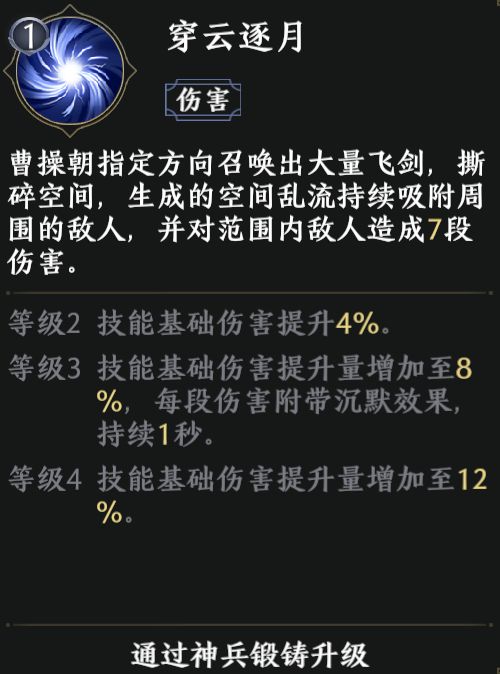 【穿云逐月】是曹操的主要伤害技能之一,他能吸附一定范围内的敌人,并造成7段伤害,玩家可以通过闪行躲开该技能。