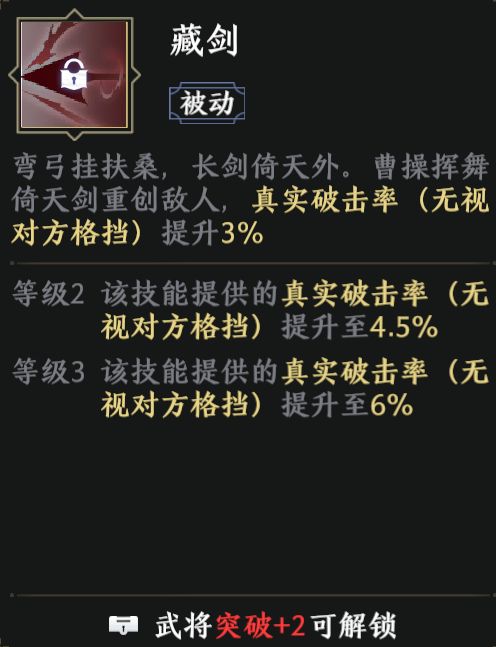 曹操突破+2时解锁。该天赋为曹操提供了一定的真实破击率,一方面增强了曹操的打肉能力,另一方面,也让他在面对脆皮时更加暴力。