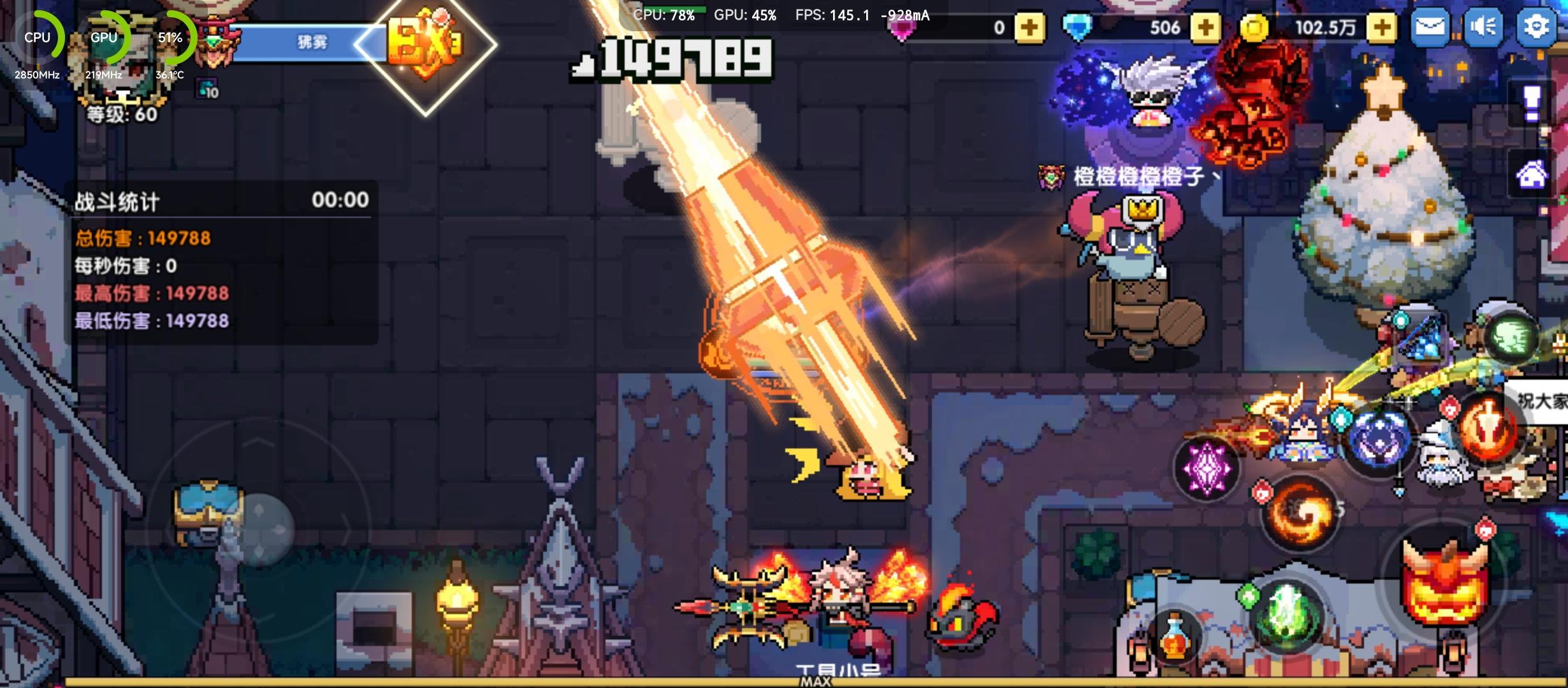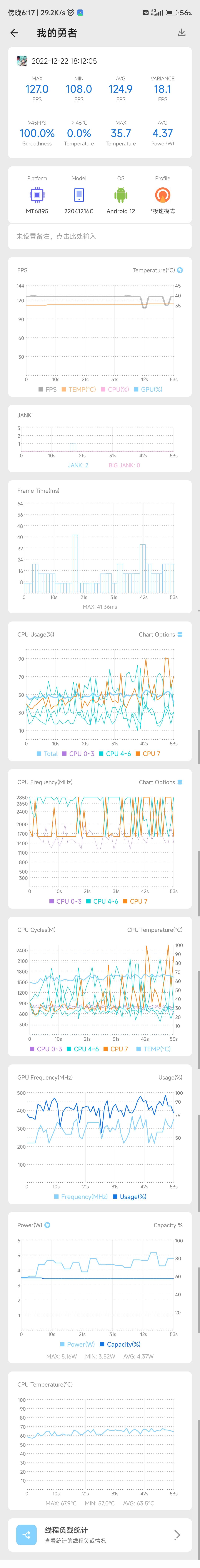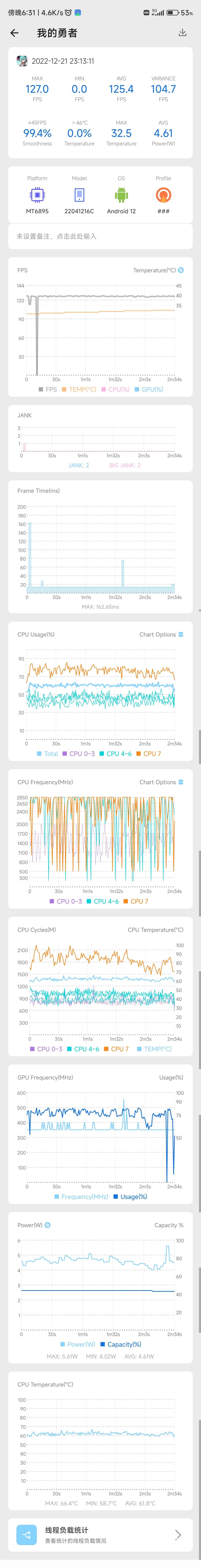 之前跑不了120是因为我这**手机调度有点问题,如果满血调度应该没压力。后面帧率上限稍微调高了点,改为160,就能比较稳了;图里掉帧实际是因为手机处理器压根没跑起来,GPU840mhz实际跑不了400mhz,CPU也不超过70%,功耗才4.37w,要知道天玑8100满载原神有6w以上,所以我觉得旗舰机应付多人特效应该问题不大?()