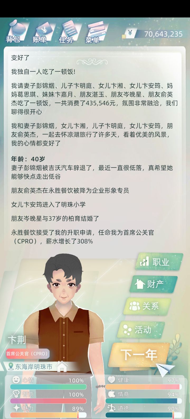 小孩每年培养但他们心情不好,就进商场,吃饭的地方左上有个加号,点了选亲朋好友一起吃饭,然后带出去玩,外滩、明珠塔有几率加情商智商,具体分不清了,烟雨阁加魅力,梧桐山加健康,湖加情商。