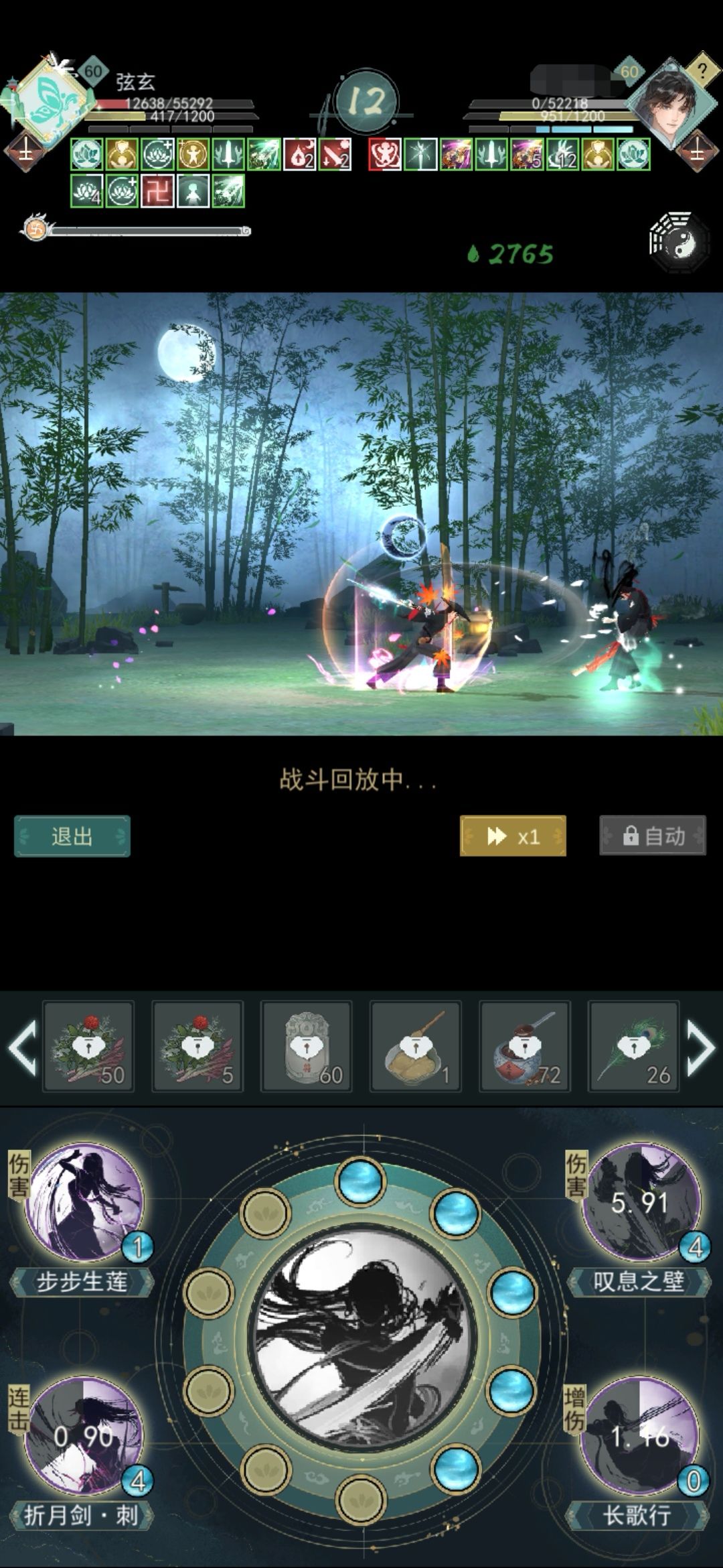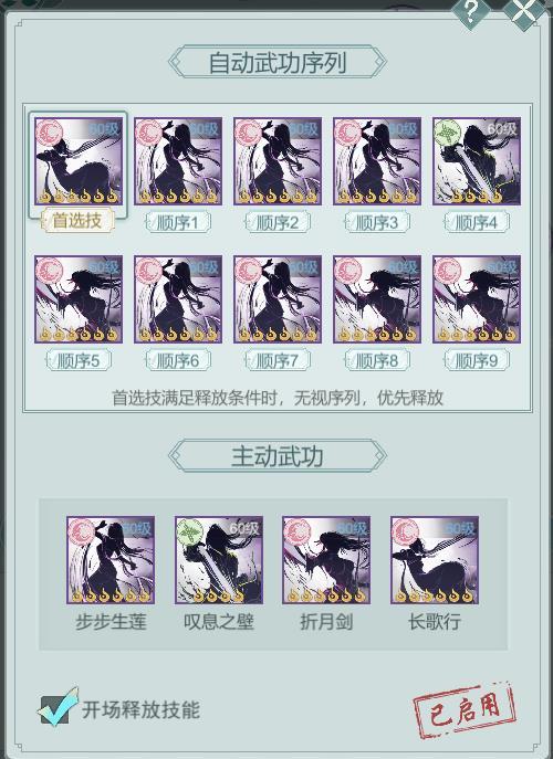 开局8剑意。步步生莲的cd是一息,连放三个步步再放叹息之壁,相当于卡在第一回合中间位置释放叹息,配合二经脉开局加速,能在自身第二回合内保证叹息之壁依然存在,然后在叹息状态下打折月剑爆发,期间因为枫叶涛加速对面释放比自己快但只打在叹息上,可以配合佛渡打怒气值,佛渡状态下能加40%暴击伤害,也有立刻反击的效果拿回一次出手权,打完折月剑配合佛渡可以刚好触发太极,此时依旧在叹息状态,可以挡住太极的爆发伤害。同武器完全克制,可越结缘打枫叶涛。对开局释放叹息的连招也有一定克制作用。