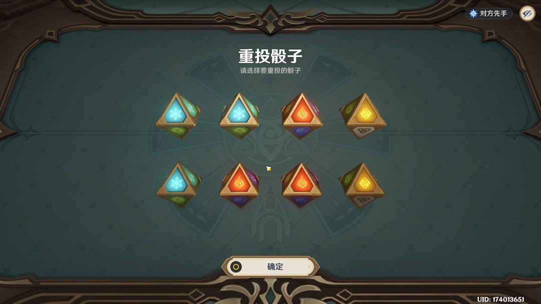另一个特别的设定就是元素的概念,每个角色通常都会绑定一种元素属性,比如刻晴是雷属性、卢姥爷是火属性,相对应地,元素骰或者说“费用”也分为七种属性,你需要与角色同样属性的元素骰才能使用技能。“费用”并不像炉石那样会每回合增长,而是一开始就固定每回合8个骰子,不过能不能投出你需要的元素就要看运气了。