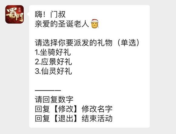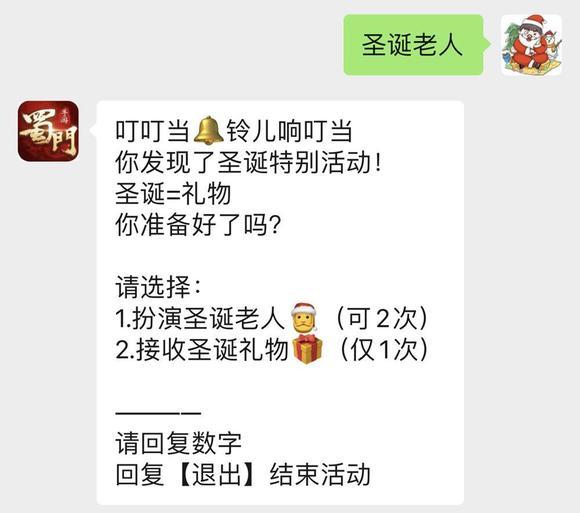 1、后台输入关键词后,开启活动,通过回复数字决定当圣诞老人派发礼物(可以选择2次)还是接收礼物(仅获得1次);
