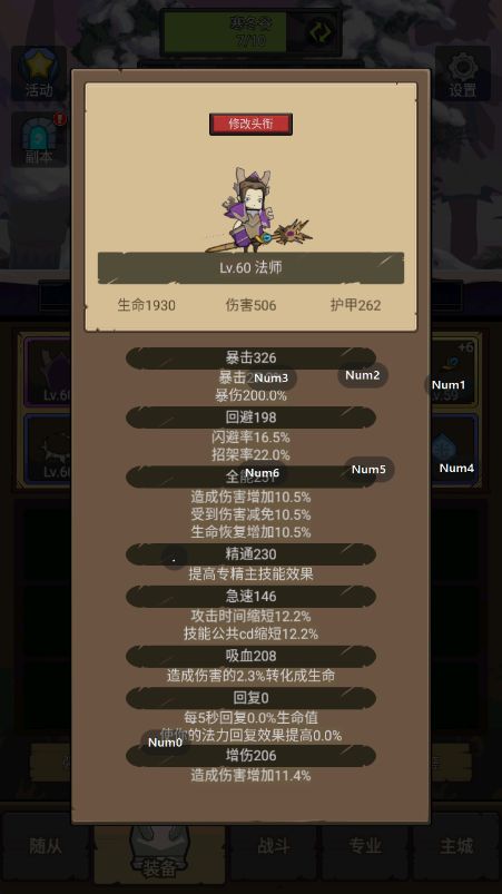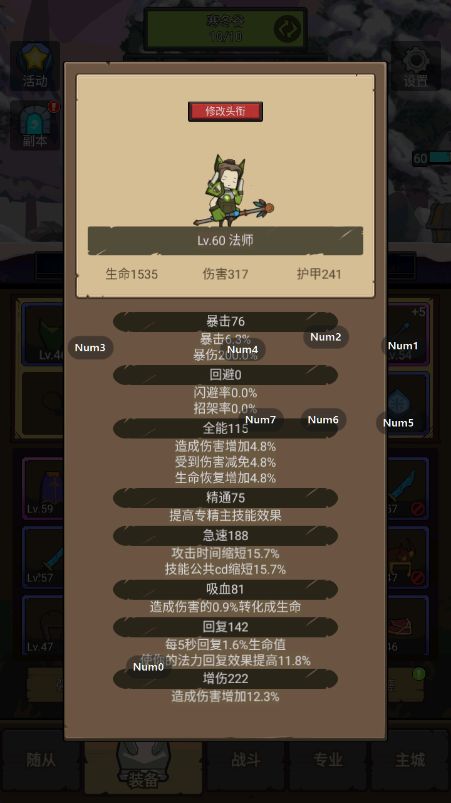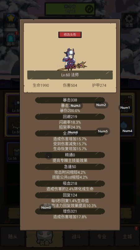 顺利到达60级,属性截个图,由于没有可以刷装备,只能将就,不能讲究。