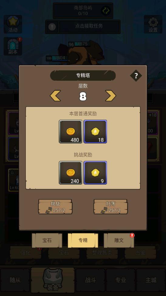 有了属性的提升,我们一口气把宝石塔可以专精塔过8层。