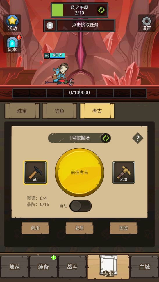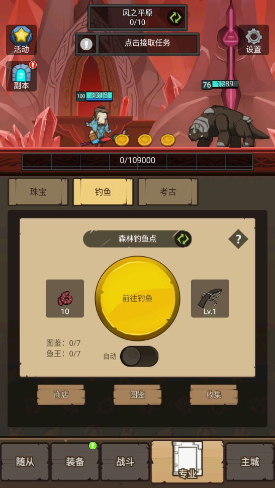 钓鱼没有玩,其实钓鱼和考古提升蛮大的,新手此时可以开始玩玩钓鱼和考古,前期金币买鱼饵就行。