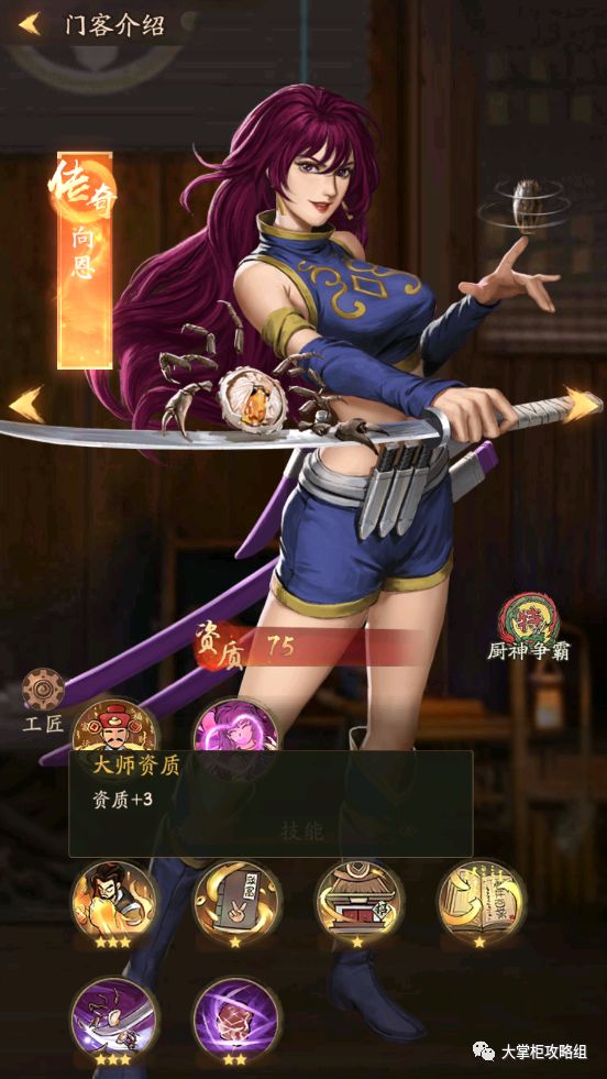 门客基础特级厨师向恩,特级厨师向恩也是传奇门客,传奇门客都是大师资质,大师资质都是3星的,卓越门客都是2星的非凡资质,优秀和普通的门客都是普通资质一星。3星的资质升级获得的赚速会更高,因为基础属性都是+3的后面用后面用资质丹进行升级星级虽然不会变但是资质会加,也可以用市井百业书籍经验升级。