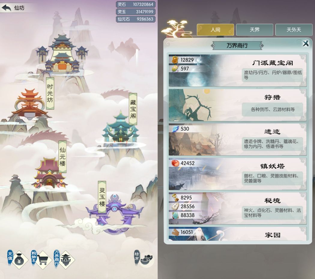 万界商行是人间、天界和天外天所有商铺的集合,道友们可以在仙坊或坊市中点开,选择点击前往需要打开的商铺,同时也可以在一级界面预览自己各商铺的货币喔。