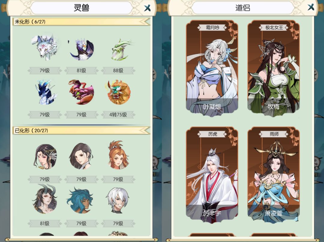 我们游戏中原本的名帖更多的是展示人物形象,而对游戏中的其他元素是较为忽视的,本次更新我们加强了道侣和灵兽的展现形式,不再仅为灵兽的未化形/化形数量和道侣的数量。更新后的名帖,点击灵兽和道侣将会展开二级界面,展示灵兽和道侣形象,给予玩家更多的展示空间。