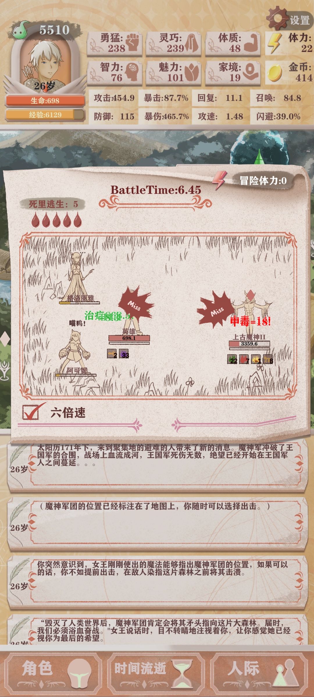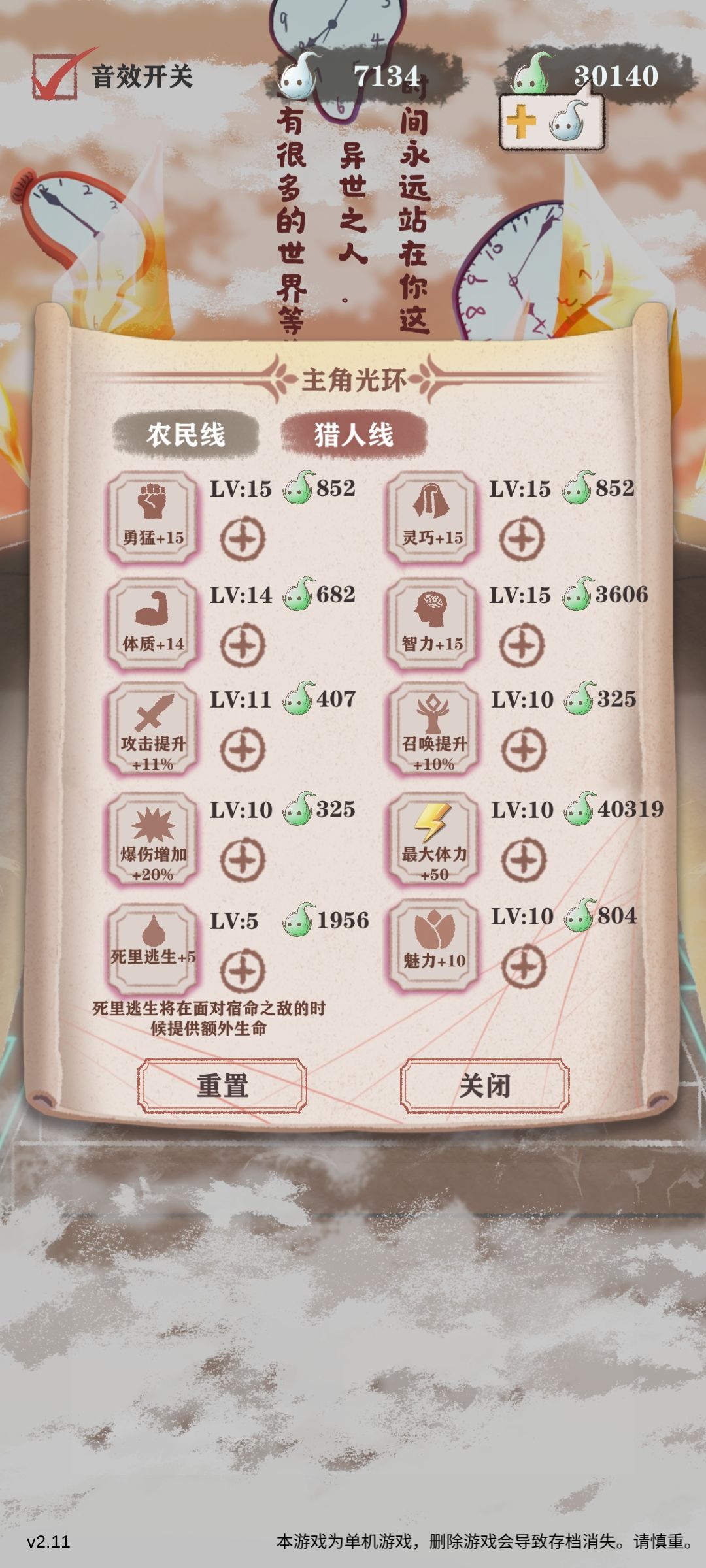 11岁之后:灵巧和勇猛对点,闪避暴击流派对两种属性都有一定要求,而且你要有65勇猛在后面才能救父亲。如果钱不够可以去猎场打猎,可以冒险开箱子,不要打工!(补充:记得预留20体力冒险,当你有把握打败boss就预留50体力)
