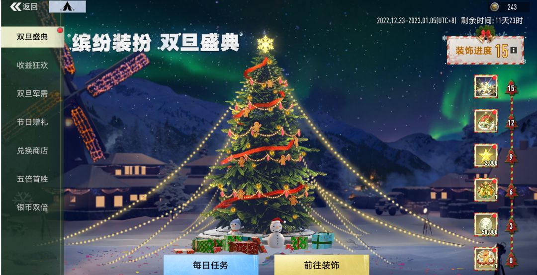 2022.12.23-2023.1.8期间,完成活跃任务获取双旦盛典装饰物,装饰新装饰物可提升装饰进度,获得限定头像、节日风格贴花等丰厚奖励。