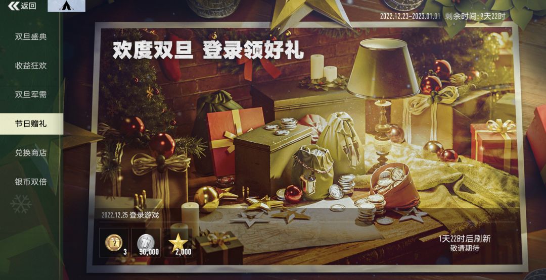2022.12.23-2023.1.8期间,参与双旦圣诞活动获取节日积分,可在兑换商店兑换高级会员、节日风格贴花、节日迷彩、限定头像等丰厚奖励。