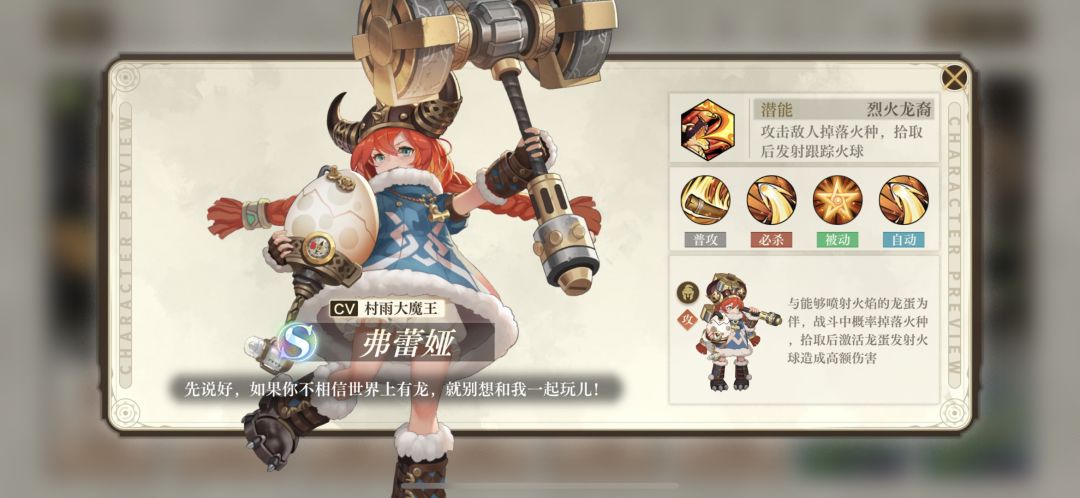 这次的弗蕾娅,从立绘上来看是个小萝莉,头上顶着一双龙角的头盔,该说不说要不是我看了她的技能了解是一双龙角,不知道的还以为是牛角呢。左手拿着个大铁锤(源武龙吼),右手还抱着了一个龙蛋。