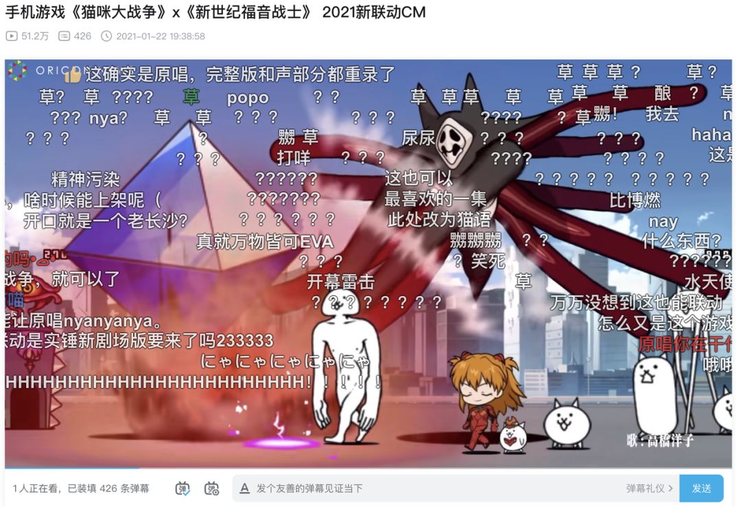 更离谱的是,为了联动,《猫咪大战争》还找到了EVA动画片头曲原唱高桥洋子老师,全程用“nya nya”的声音完整重唱了一遍《残酷天使的行动纲领》。