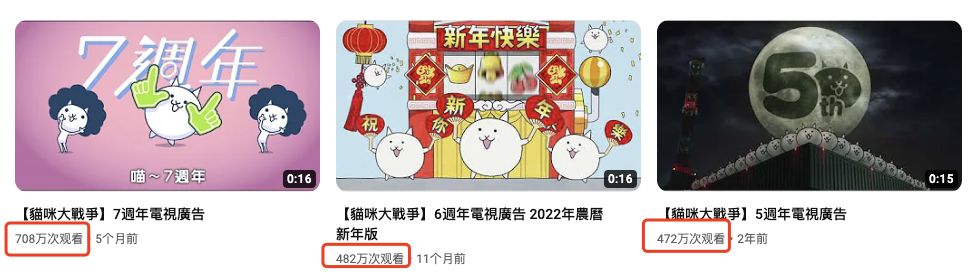 除此之外,《猫咪大战争》还有7周年洗脑广告、新年洗脑广告等,传播数据同样都非常恐怖。