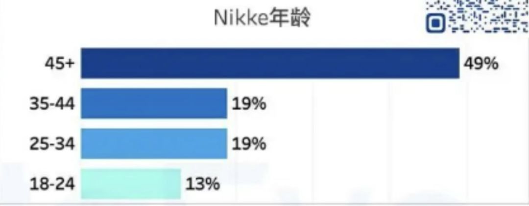 第一离谱的是《NIKKE:胜利女神》,这游戏45岁+的大叔占比高达49%,二次元手游最常见的年轻玩家反倒是少数。