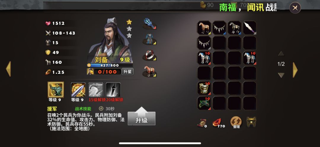 英雄选择刘备、关羽,防御塔使用寒冰塔、天雷塔,战术卡使用练兵、富豪、术塔精通、破敌。刘备、关羽装备如图所示