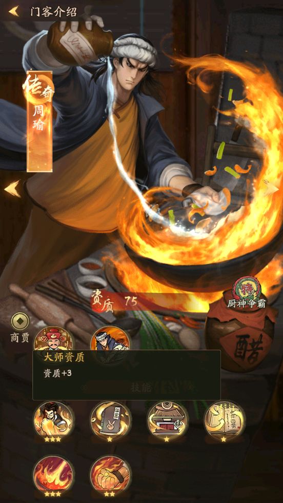 特级厨师周瑜,特级厨师周瑜也是传奇门客,传奇门客都是大师资质,大师资质都是3星的,卓越门客都是2星的非凡资质,优秀和普通的门客都是普通资质一星。3星的资质升级获得的赚速会更高,因为基础属性都是+3的后面用后面用资质丹进行升级星级虽然不会变但是资质会加,也可以用市井百业书籍经验升级。