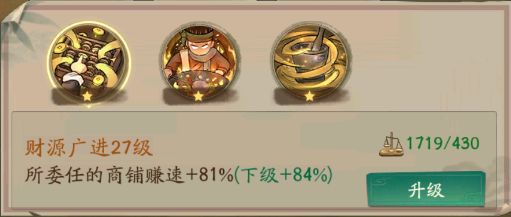 门客委任,这个技能加赚速是非常的快的,会增加门客所委任的商铺赚速而且是百分比的赚速加成。需要消耗算盘来进行升级。门客委任的有个小技巧,等级高的尽量往基础赚速比较高的商铺上委任。
