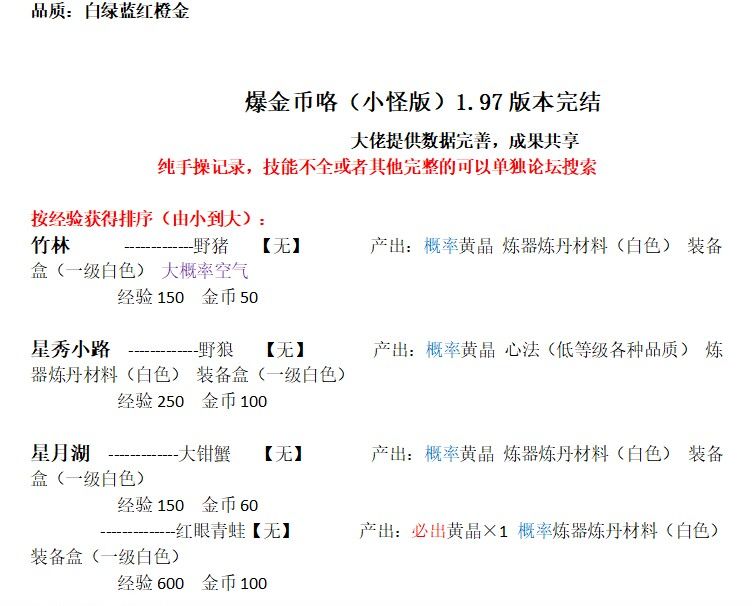 小怪掉落记录(大佬合作1.97完结)+萌新其他记录和看法(持续更新)