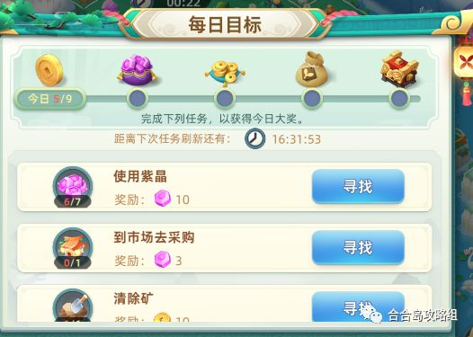 点开之后会显示每日目标,完成下列任务,可以获得相应的任务奖励,每天刷新一次,各位岛主记得每日按时去完成相应的任务哦,任务可以获得相应的紫晶和金币,不容错过。