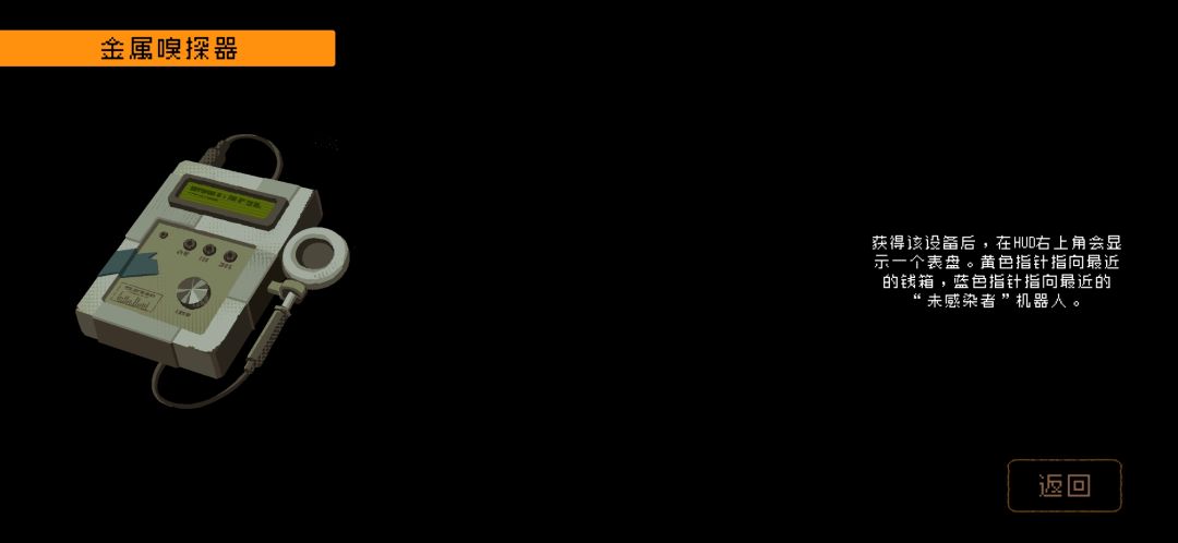 金属嗅探器,不知道哪里获得的,蓝色指针会指向最近的未感染机器人,跟着指针走或者传送一下看两射线交点(前提是那地图只有一个机器人)就能很轻松找到机器人位置