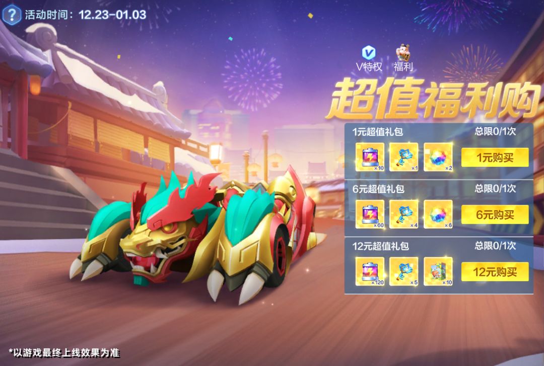 活动期间可直购两档超值礼包,支付成功后可立即获得不同档位电池、宝宝礼物盒、祥瑞龙车星愿结晶礼包奖励。