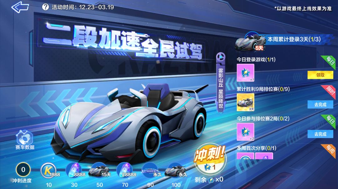 完成任务即可免费领取搭载全新“自动二段加速”特性的传说级竞速赛车雾隐星陨,向着2023年全力出发!