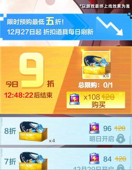 全新顶级竞速赛车【黑金甲虫】即将登场,宝宝特意为车友们准备了神秘钥匙折扣预购活动~12月27日-12月31日福利站开启【神秘钥匙预购】限时福利活动,活动期间车友们每天都能以折扣价购买神秘钥匙礼盒*4。预购活动共计5天,限时预购最低五折!车友们不要错过哦~