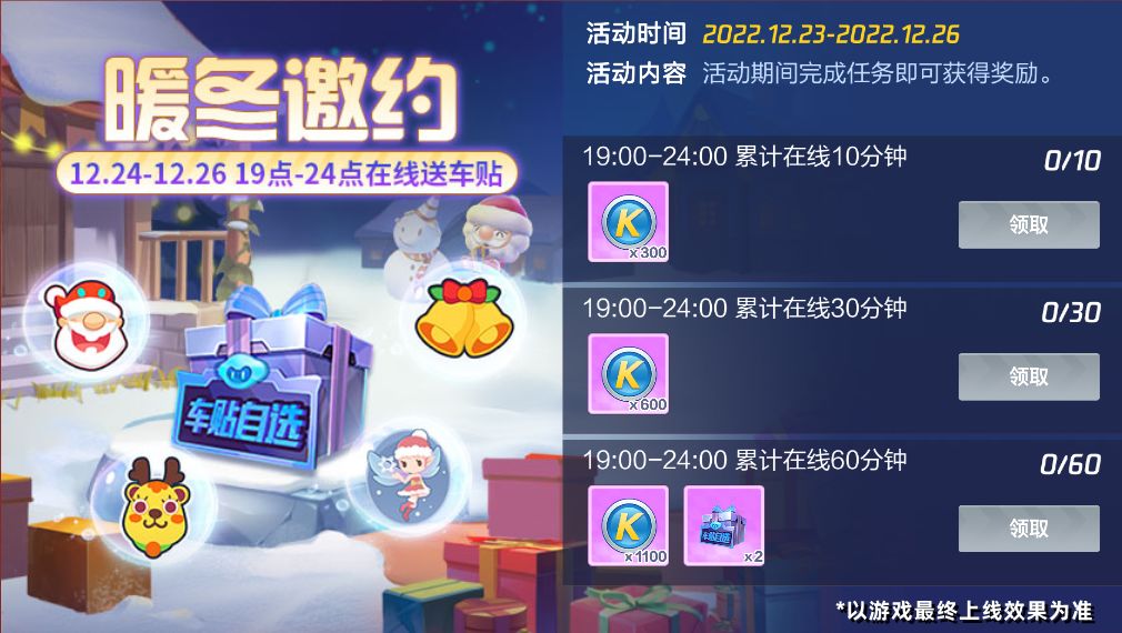 活动中心现已开启【暖冬邀约】在线送车贴活动,12月24日-12月26日,车友们每晚19点-24点累计在线时长即可领取酷币、车贴自选礼包~