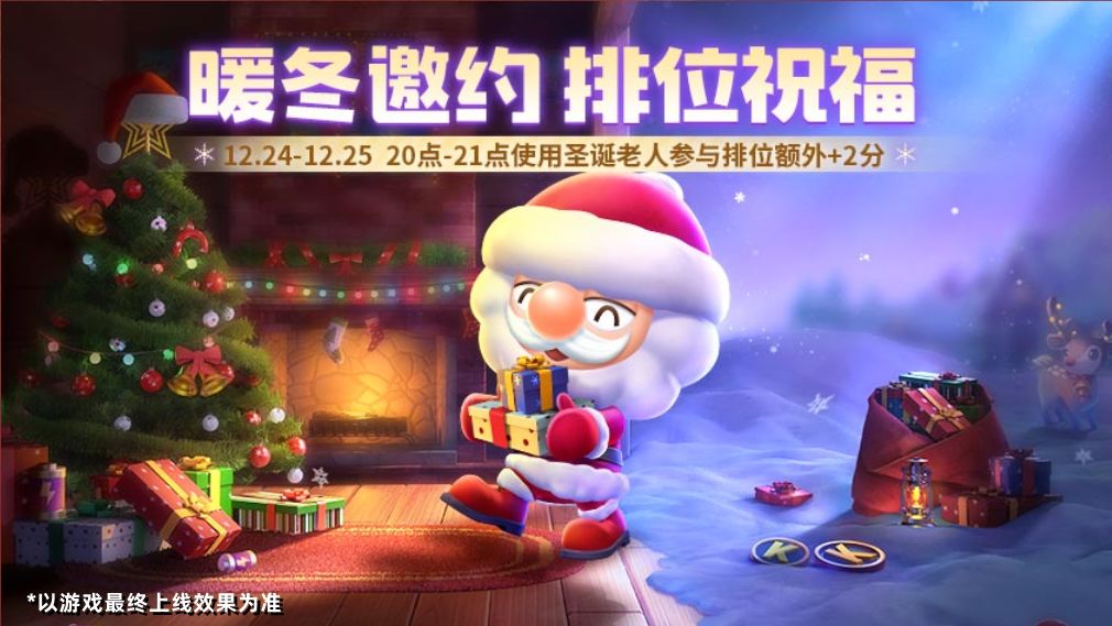 12月24日-12月25日,每晚20点-21点将开启【暖冬邀约】排位祝福活动,车友们在活动时间内使用传说车手圣诞老人参与排位对局结算额外+2分~