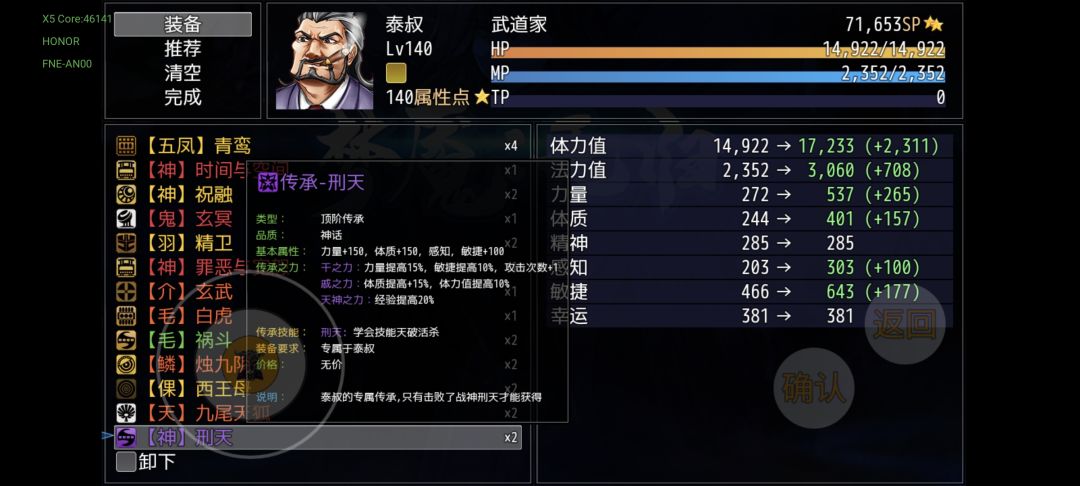 三周目开始第三四幕的奇珍异宝袋(紫色),开启会与刑天战斗,胜利后可以获得泰叔的专属传承“神·刑天”,你只要看见重点“普攻次数+1”即可