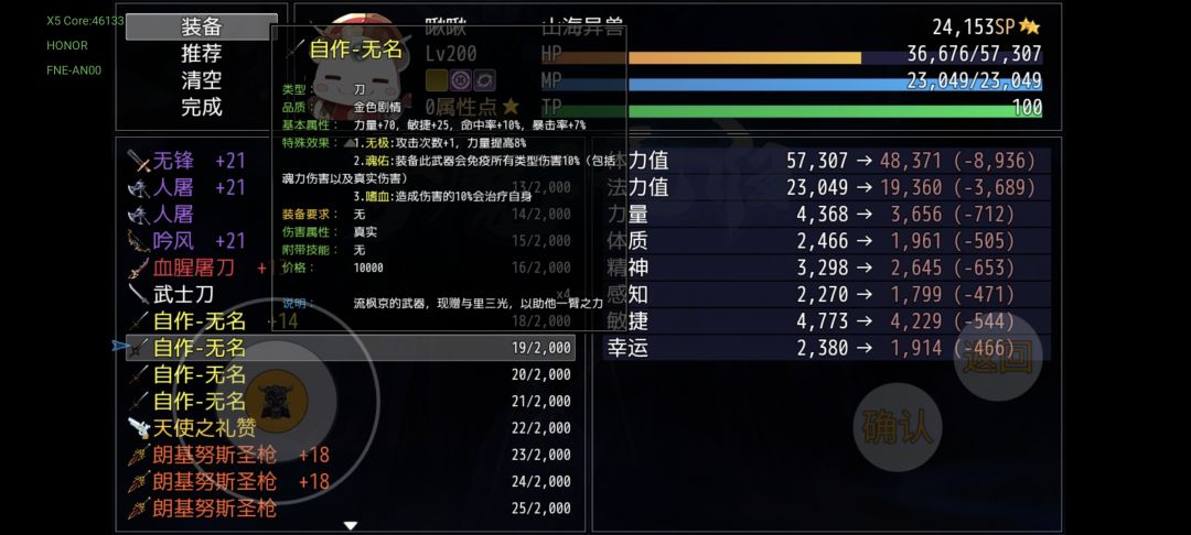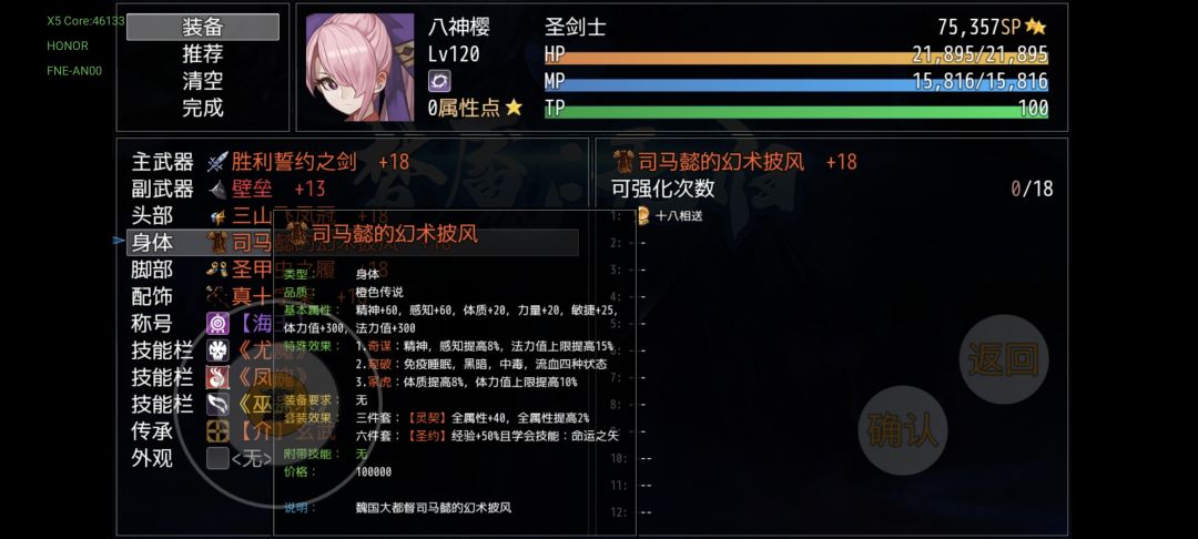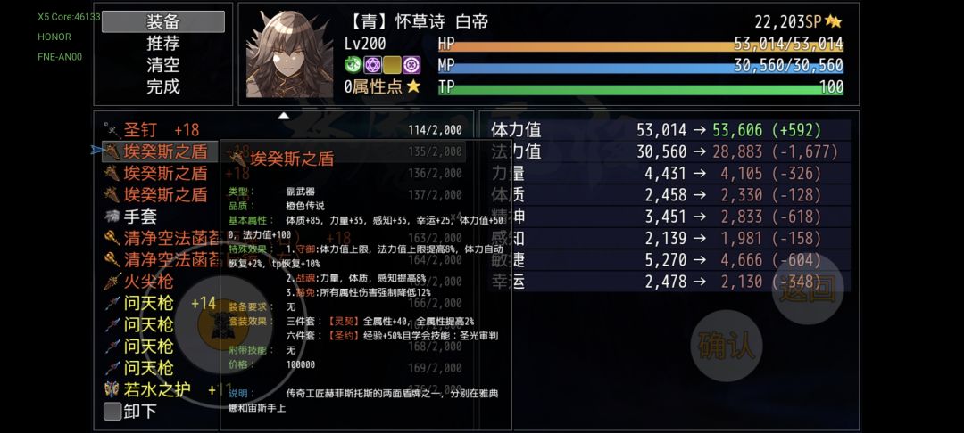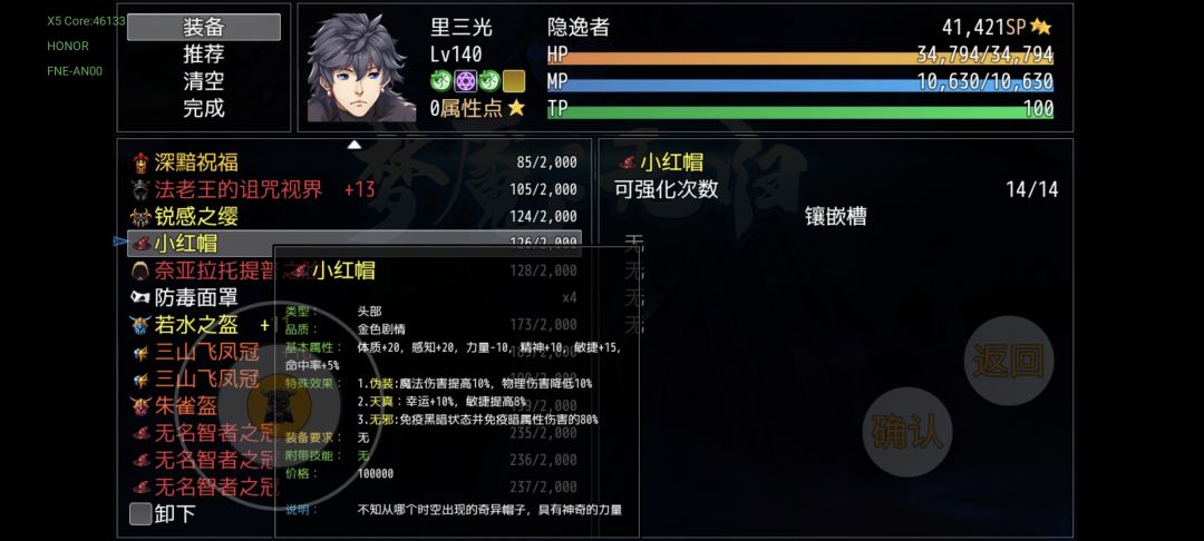 这时候的装备已经到了成型和过渡的转折点,如果你能准备足够积分的话,红装即将被淘汰,当然优秀的红装这一幕也不会缺乏,忍者红叶会掉落上忍的金丝软甲(敏捷最高的衣服),邪神臂障切割的壁垒(附带削弱技能折戟沉沙,非常关键),还有一件因果律装备“自作—无名”,这把刀是全属性伤害减少10%,相似的属性我可只在二周目的艾奎斯之盾和四周目的裁决上见过