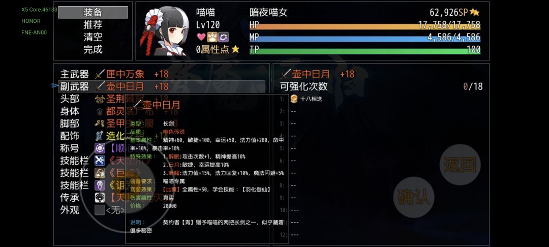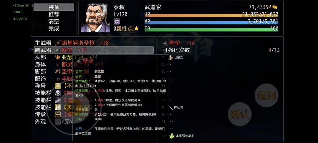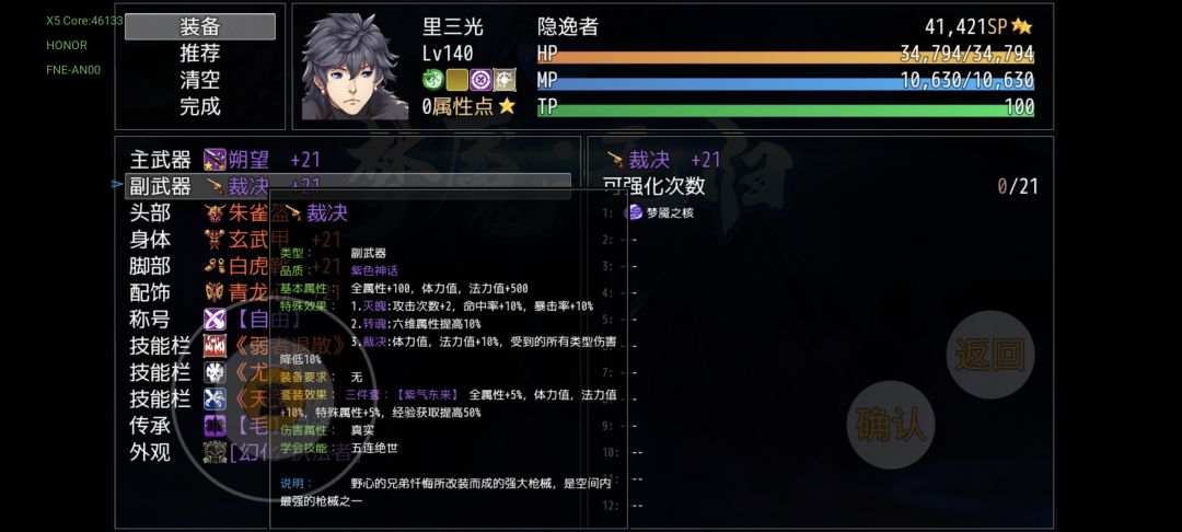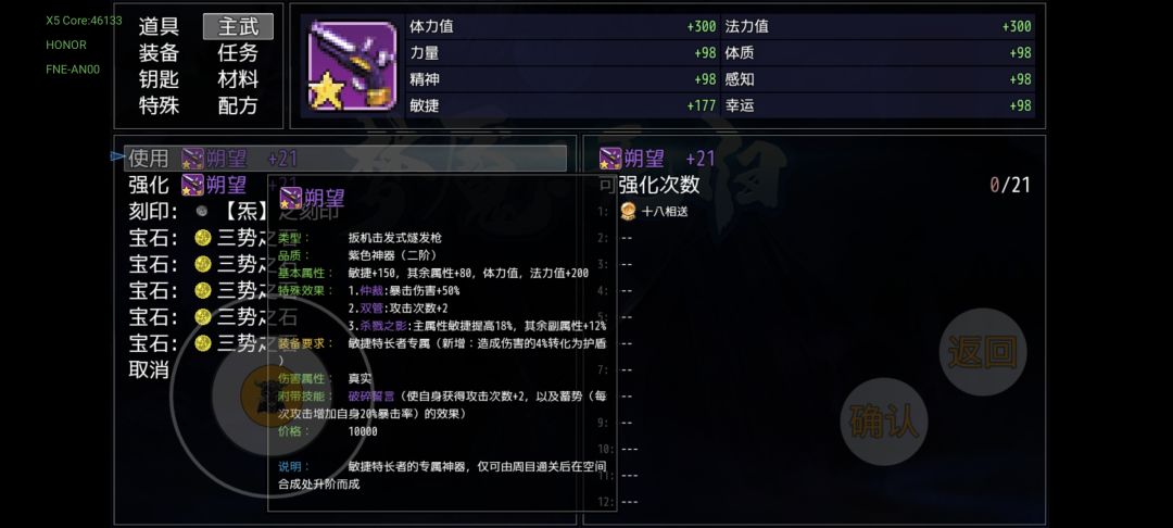先说装备自带的强化和镶嵌,该功能是通过道具—主武(装备)呼出,选择装备进入该界面