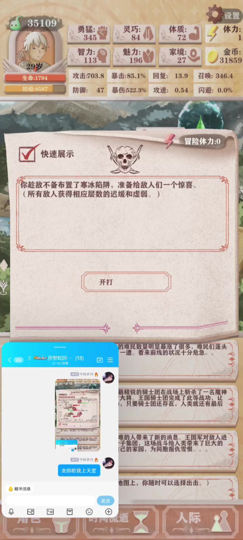 属性选择,十岁前除了老爸好感其他全部无脑练智力(1岁睡觉三次梦回乡村能+4智力),老婆没用都不要,后面无脑练勇猛,