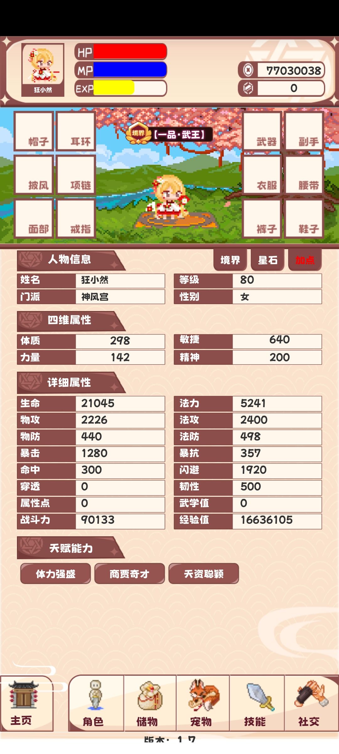 需要注意的是人物的四维属性还有几个来源,一个是装备的附带和鉴定,一个是功法,一个是丹药,这三位都是容易被萌新忽略的!